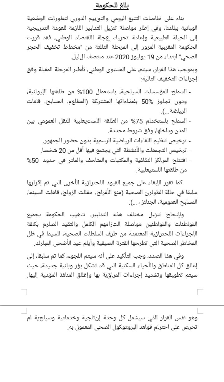 أعلنت الحكومة المغربية في بلاغ نشرته، اليوم الأحد، مرور المغرب إلى المرحلة الثالثة من « مخطط تخفيف الحجر الصحي »، وذلك إبتداءا من اليوم، 19 يوليوز 2020 على منتصف الليل.