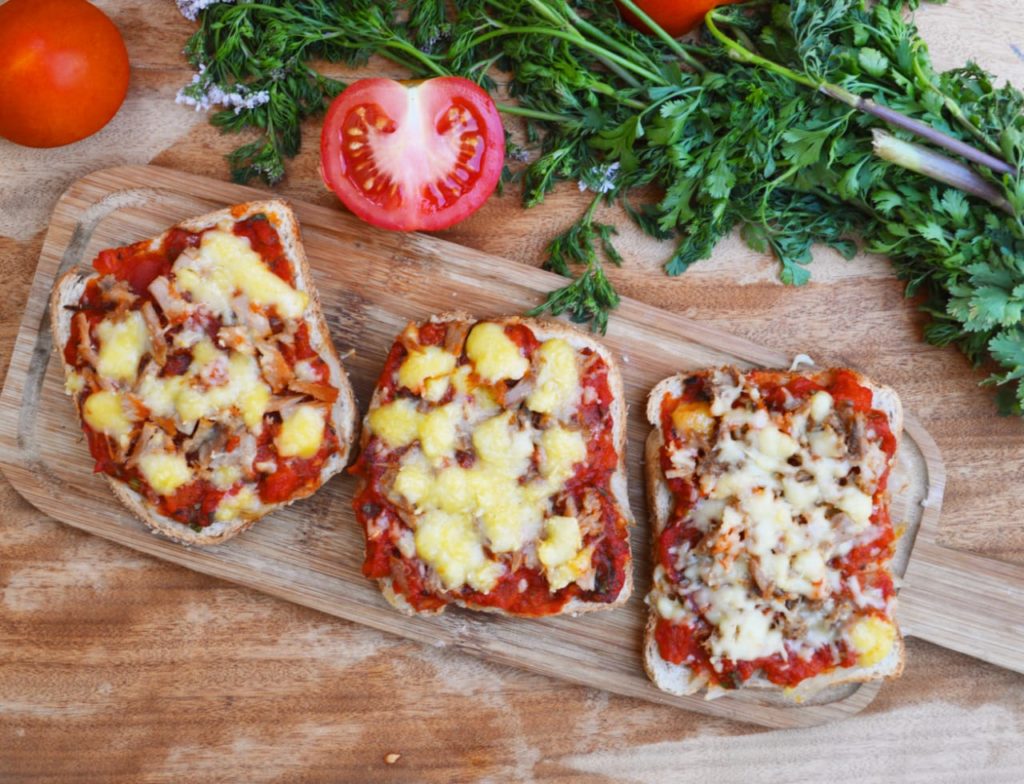 - وضع الصلصة فوق قطع خبز التوست مع إضافة الطون ثم الجبن.