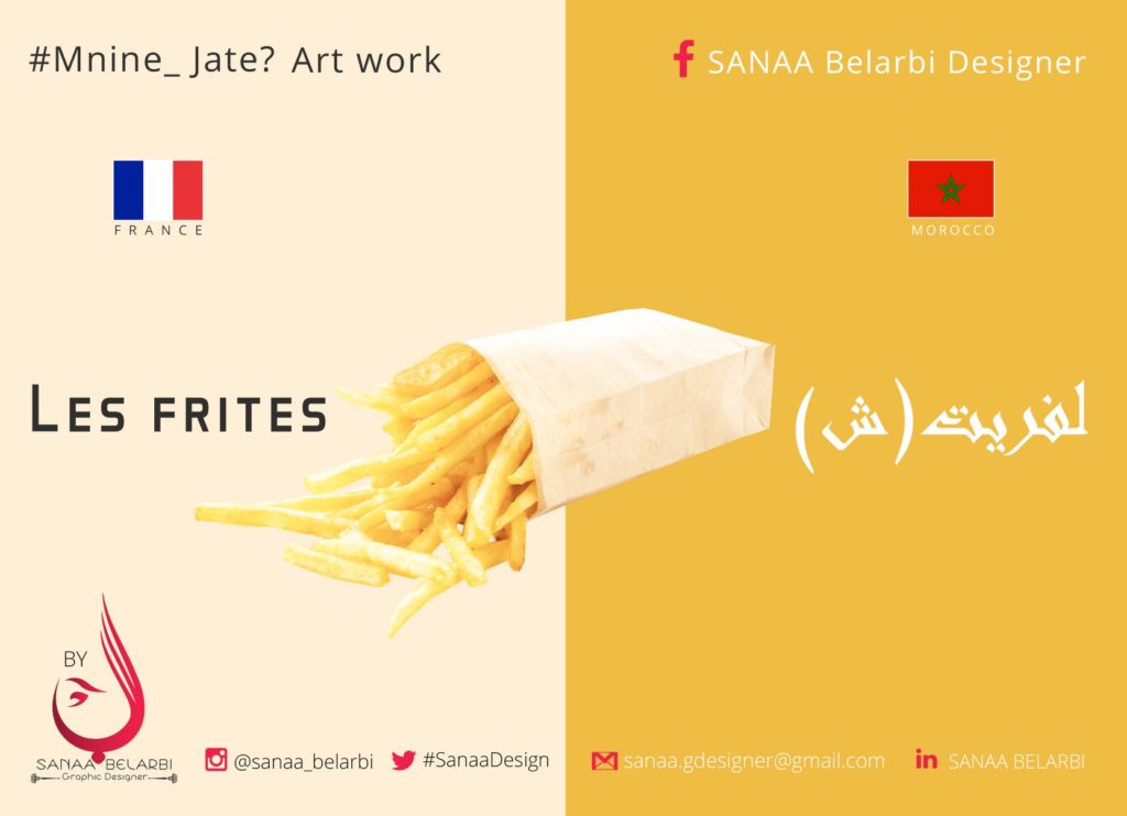 يبدو أن الإبداع هو الحل لجميع المشاكل، وأن المشاكل لا تحل إلا بالإبداع .. جددت سناء بلعربي مرة أخرى اللقاء من خلال عملها الجديد بعد التصميمات التي عملت عليها سابقاً والتي كانت بخصوص الماركات التجارية. موضوع هذه التصميمات هو التعريف بأصول الكلمات التي نستعملها في حياتنا اليومية بالدارجة المغربية. أغلب هذه الكلمات جاءت من فرنسا وإسبانيا نتيجة الإستعمار.