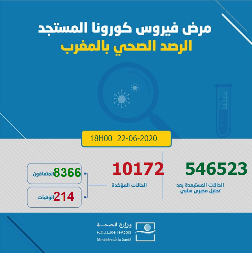 إلى حدود الساعة السادسة من زوال اليوم الإثنين 22 يونيو، تم تسجيل 195 حالة إصابة جديدة بفيروس « كورونا » لترتفع حصيلة الإصابات المؤكدة إلى 10172 حالة.