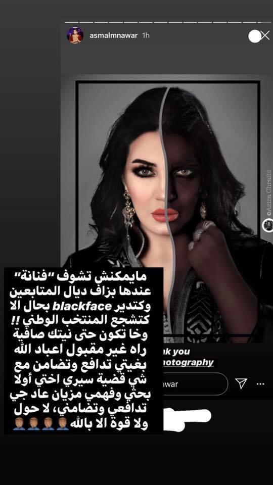 يعتبر إستخدام « الوجه الأسود » أحد أكثر الممارسات إنتقادًا في الدول الغربية، لما له من إساءة لذوي البشرة السوداء. لم يفتح هذا النقاش بعد في المجتمعات العربية، إذ لا زال يستخدم « الوجه الأسود » في بعض الأعمال الفنية و الكوميدية. هذا ما قد يفسر صورة الفنانة أسماء المنور على صفحتها في إنستغرام.