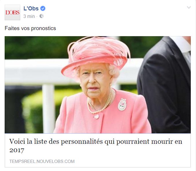 في فقرة غريبة من نوعها تطرقت لها الصحيفة الأسبوعية الفرنسية « لوبسيرفتور L’observateur » المشهورة تحت إسم « لوبس L’Obs »، والتي كان موضوعها التكهن بأبرز الشخصيات العالمية التي من الممكن أن تودعنا خلال هذه السنة الجديدة، لتعود مرة ثانية وتغير عنوان المقال إلى « الملكة اليزابيث أو بير كاردان… من سيغادرنا في 2017؟ ».